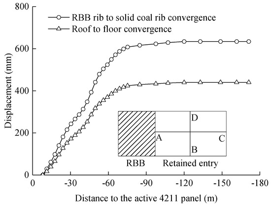 To evaluate the performance of GER-LMH with supercritical retained entry width, field monitoring results of the GER-LMH with supercritical retained entry width during the period of 4211 panel mining are presented in Figure 16. The figure shows that when the active 4211 panel passed the monitoring site at a distance of 120 m, the roof to floor displacement and solid coal rib to RBB rib placement were about 440 mm and 634 mm, respectively.