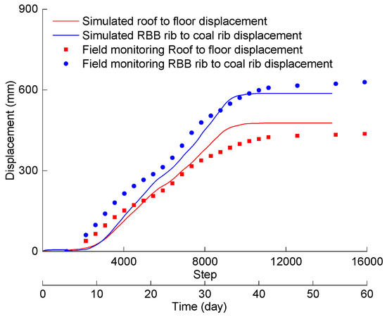 In the field test, GER with supercritical retained entry width was conducted in the 4211 panel, and the construction speed of the retained entry is 1.8 m/day. Figure 17 shows the comparison between the field measured and numerical simulated displacement during the period of 4211 panel mining. The red solid line presents the numerical simulated roof to floor displacement and the blue solid line presents the numerical simulated RBB rib to coal rib displacement, while the filed monitoring GER surrounding rock displacement curves are shown by triangles and squares. Both the filed monitoring measured and numerical simulated GER surrounding rock displacement curves show a similar change trend. After a period, both the roof to floor displacement and RBB rib to coal rib displacement arrive a constant value.