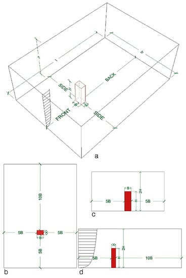 Figure 1. (a) Computational domain and location of the building; (b) top view; (c) front view; (d) side view.