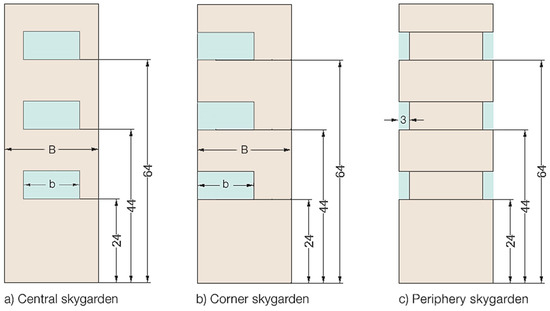 Pomeroy [42] described six types of sky garden based on their spatial morphology. Amongst them, the stepped terrace and fragmented zone behave more like a huge balcony; nevertheless they all modify the airflow pattern and provide comfort for the occupants in terms of social and economic benefit and increase the life of building material [43,44]. In addition, gardens located on the roof, although they could provide ecological benefit for the building, they are usually not included in the same typology. The present study adopts the hollowed-out (centre type), eroded corner (corner type), and interstitial type (periphery) of morphology for the sky garden as detailed in [42].
