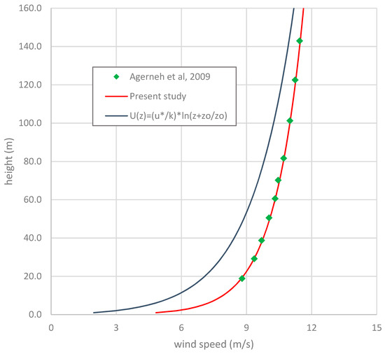 However, for validation purposes, the inlet velocity profile is modelled after Agerneh et al. [40] and the outlet is set to 0 pa pressure. A comparison of their profile to the lag-law expression developed by Richards and Hoxley [45], where u * is 0.8, k is 0.4, and zO is 0.6 for the case in hand, is shown in Figure 3. The air temperature for the inlet is kept constant at 300 K (27 °C). Boundary condition for the outlet is set to pressure outlet with 0 pa. Gravity of −9.8 m/s2 is set for the simulation domain to account for buoyancy. Symmetry for top and side walls and no slip condition for ground implemented as a standard roughness model.