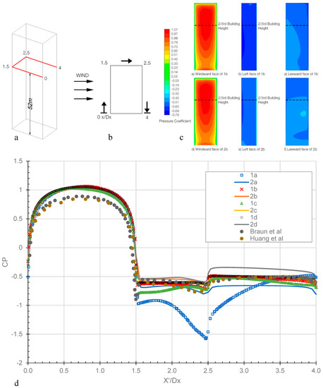 The pressure coefficients obtained for each model are shown in Figure 6d. All 18 models had similar values along the windward face, although it is slightly greater than the values predicted in the literature by Braun et al. [46] and Huang et al. [38]. On the leeward faces, most models had comparable pressure coefficients, except for some variations by lower-resolution meshes. There was good agreement between the present study and models obtained from the literature, especially the models 1b, 1c, 2b, and 2c. Major deviations were seen for the case 1a along the leeward faces, underpredicting the pressure. Models 2a, 2d, and 1c also showed underpredicted values as compared to the literature, but only showed slight deviation.