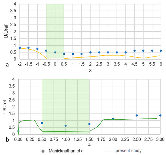 The porous vegetation model was validated against the numerical study by Manickathan et al. [29]. The simulation domain was modelled accordingly, consisting of a porous tree medium represented by 1 m × 1 m area placed 0.5 m above ground (see Appendix A). The medium is placed in a 35 m × 11.5 m field representing the surrounding air fluid. The original inlet wind profile as proposed by Manickathan et al. [29] employs the Richards and Hoxey [45] model (Equation (9)) with von Karman number equal to 0.41 and zo = 0.0217 m, and the inlet air temperature was set at 32 °C (305 K). The corresponding permeability and inertial resistance coefficient were calculated using Equations (10) and (11). Figure 7a is a comparative plot of wind speeds for different porosity of vegetation when the analysis is done parallel to inlet wind direction, at a height of 1m. The axis is centred at the vegetation. Figure 7b is a plot of wind speeds when the analysis is done in the vertical direction, at a distance of 1.5 m leeward of the vegetation.