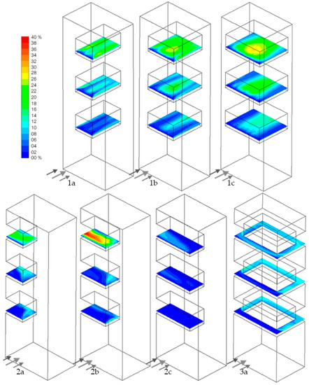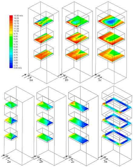 Figure 8. Velocity contours at different heights for different sky garden configurations; (1a) Central sky garden b/B = 0.4, (1b) Central sky garden b/B = 0.6, (1c) Central sky garden b/B = 0.8, (2a) Corner sky garden b/B = 0.4, (2b) Corner sky garden b/B = 0.6, (2c) Corner sky garden b/B = 0.8, (3a) Periphery sky garden a/A = 0.5.