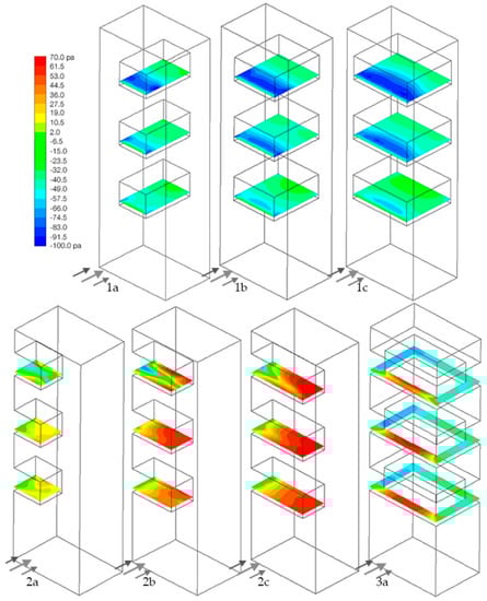 Figure 9. Pressure contours at different heights for different sky garden configurations; (1a) Central sky garden b/B = 0.4, (1b) Central sky garden b/B = 0.6, (1c) Central sky garden b/B = 0.8, (2a) Corner sky garden b/B = 0.4, (2b) Corner sky garden b/B = 0.6, (2c) Corner sky garden b/B = 0.8, (3a) Periphery sky garden a/A = 0.5.