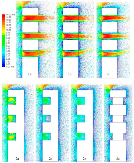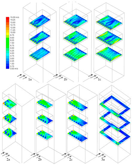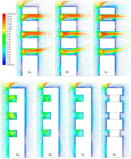 Figure 18. Velocity gradient at sky gardens with trees with oblique wind direction; (1a) Central sky garden b/B = 0.4, (1b) Central sky garden b/B = 0.6, (1c) Central sky garden b/B = 0.8, (2a) Corner sky garden b/B = 0.4, (2b) Corner sky garden b/B = 0.6, (2c) Corner sky garden b/B = 0.8, (3a) Periphery sky garden a/A = 0.5.