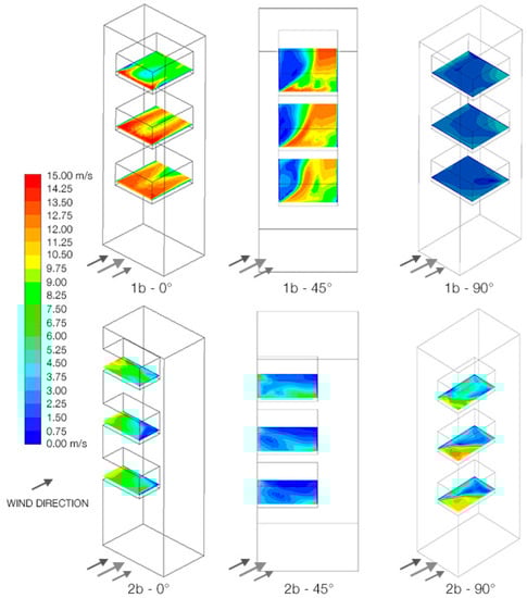 As explained before, due to the fluctuating nature of wind direction, air flow was simulated to flow obliquely with respect to the building, covering all sides. Figure 18 and Figure 19 show velocity and temperature gradient, respectively, at the sky gardens 1b and 2b when wind flows obliquely to the building. The central sky garden illustrates a sharp velocity drop with the introduction of a row of tree at its windward and leeward edge. From the illustrated Figure 18 (1b at 0°, 1b at 45°) it is observed that speeds of about 10–15 m/s, which were classified as unsafe, show decreased speeds in the range 6–10 m/s with the addition of trees. The leeward edge in 1b at 45° illustrate speeds of about 9 m/s (class D), which gradually decreases to about 2 m/s (class A) towards the wall. When the wind is blown at 90° to the building (1b at 90°), the speeds are less than 1 m/s.