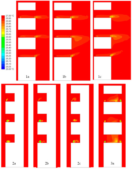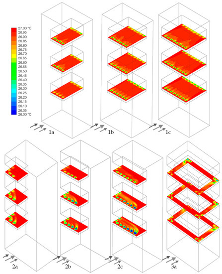 Figure 19. Temperature gradient at sky garden with trees when wind flows obliquely to the building; (1a) Central sky garden b/B = 0.4, (1b) Central sky garden b/B = 0.6, (1c) Central sky garden b/B = 0.8, (2a) Corner sky garden b/B = 0.4, (2b) Corner sky garden b/B = 0.6, (2c) Corner sky garden b/B = 0.8, (3a) Periphery sky garden a/A = 0.5
