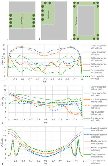 Figure 17. Location of centreline for analysis at: (a) Central sky garden; (b) corner sky garden, and (c) periphery sky garden; velocity profile along the centreline of (d) central sky garden; (e) corner sky garden; and (f) periphery sky garden.