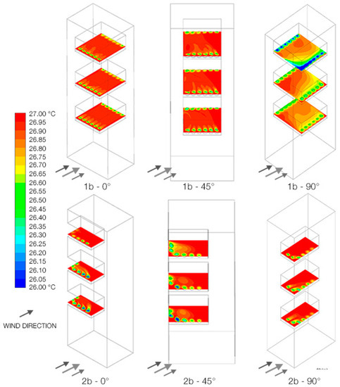 From the illustrated contours of temperature (Figure 19), it is evident that air temperatures are significantly reduced in areas with low wind velocity. The sky garden 1b shows maximum temperature drop when it faces away from the wind, limiting the air velocity flowing through it. A lower temperature drop is observed near the centre while a higher temperature drop is seen near the openings in the case of 1b at 90°. Similarly, the corner configuration also displays a higher reduction in air temperatures at locations where wind speeds are low, at the windward edges in cases 2b at 0° and 2b at 90°, and the central zone in 2b at 45°.