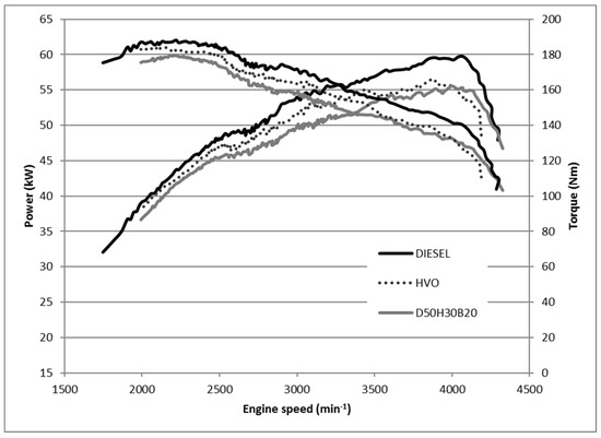 The results of performance parameters for each fuel are shown in Figure 2. It is evident that the best performance parameters have been reached by using pure diesel fuel while the other biofuels reached little bit lower values of power and torque. As shown in Table 7, diesel reached 60 kW and a torque of 188 Nm, followed by HVO, where the performance was slightly below with the value of 57 kW and the torque of 184 Nm. The lowest performance parameters were measured by the mixed fuel D50H30B20, where the power reached 56 kW and the torque 180 Nm.