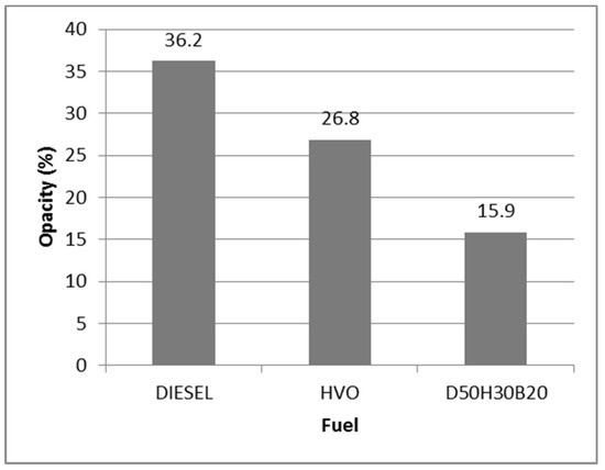 The highest opacity of 36.2% was detected for the pure diesel fuel. HVO exhibited an opacity slightly below 26.8% and the lowest opacity was measured for D50H30B20—only 15.9%.