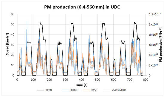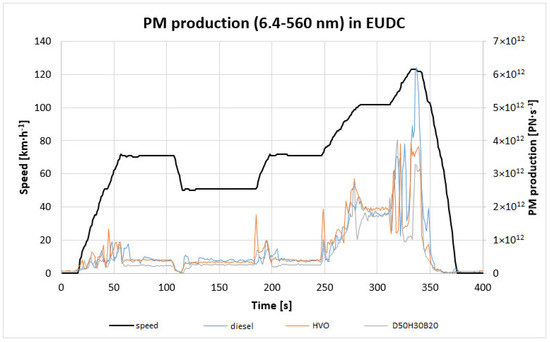 The PM production had a significant peak by acceleration mode during the cycle. The lower mass concentration at steady speeds may partly be explained by higher amounts of air (higher relative air-to-fuel ratio) available for combustion: higher air concentration provides better burnout of the fuel particles, thus leading to lower mass concentrations [28].