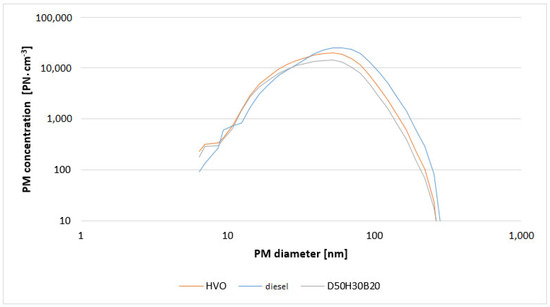 The highest particulate concentration (25,000 PN cm−3) was reached on diesel fuel ranging from 55 to 60 nm. The second highest concentration (20,000 PN cm−3) was measured for HVO ranging from 45 to 55 nm. The lowest particulate concentration (15,000 PN cm−3) was for mixed fuel D50H30B20, from 45 to 50 nm.