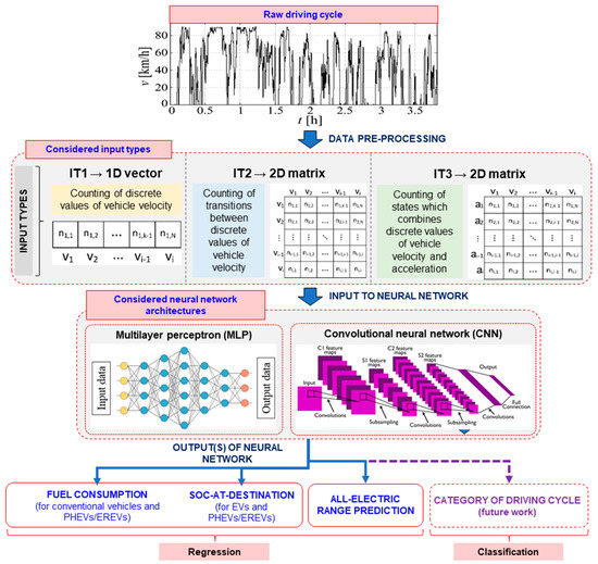 According to the best of the authors’ knowledge, EV energy demand modeling based on deep NNs and known driving cycle features as inputs has not been considered in the literature so far. To fill the gap, this paper proposes a novel data-driven approach of EV energy demand modeling based on deep neural networks. The approach is particularly suitable for cases when large driving cycle datasets are available, as in the case of vehicle fleets equipped with GPS/GPRS tracking equipment. A preprocessing method for transforming time- and distance-varying driving cycles into 1D or 2D static maps is proposed, in order to make them appropriate for use as inputs to neural networks. Several deep feedforward artificial neural network architectures including multilayer perceptrons (MLPs) and CNNs have been considered and analyzed along with three different model input formats (see an illustration in Figure 1). Necessary driving energy demand data is generated through numerous simulations of an extended range electric vehicle (EREV) model over a wide set of driving cycles recorded for a delivery vehicle fleet. Two energy demand-related models are derived based on the generated data, in order to predict: (i) the battery SoC and fuel consumption at the end of driving cycle (i.e., at destination), and (ii) all-electric range (i.e., the distance that can be travelled in pure electric driving prior to a hybrid driving mode being engaged; AER). The derived models can be applied in different off-line energy demand studies (e.g., in energy planning), as well as in on-line energy consumption prediction and energy management strategies.