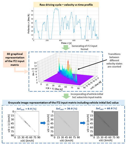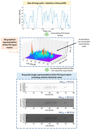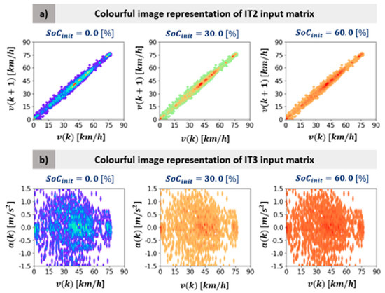 Apart from the driving cycle-related velocity and acceleration information, the initial battery SoC value (SoCinit) needs to be included in the NN input to be able to predict the energy demand (e.g., SoC at destination). Various methods have been considered within this study, such as appending the input vector/matrix by SoCinit, multiplying each element of input matrix by SoCinit, etc. A simple addition of initial SoC to the overall input matrix has been found to be the best approach in terms of NN prediction accuracy. Exceptionally, in the IT1 case the initial SoC value is appended to the input vector. The addition of vehicle initial SoC value for the cases of matrix input formats (IT2 and IT3) can be visualized as a magnification of grey intensity in the graphical representation of the matrix, as illustrated in Figure 2 for the case of IT2 and initial SoC values ranging from 0.3 to 0.6. This figure shows that IT2 has very sparse structure (i.e., useful information just around diagonal positions), which affects the quality of recognition of sample features, while requiring long learning time of NN due to high dimension of input matrix. This difficulty is effectively overcome in the case of IT3, which is characterized by the reduced input dimensions (see Table 1), far less sparse structure (see Figure 3), and directly included acceleration information. The reduced input dimension makes the NN training process less time consuming due to a lower number of trainable parameters. For the sake of better visualization of addition of initial SoC to 2D inputs in the case of IT2 and IT3, the inputs are shown as contour plots in Figure 4.