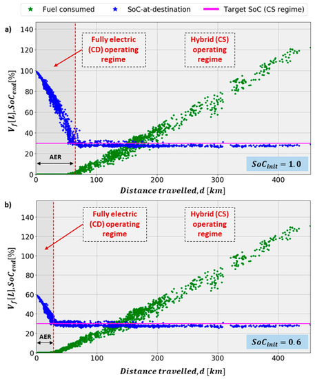 EREV fuel consumptions () and SoC at destination () in dependence of total distance travelled () for cases of initial SoC values (a), and (b).