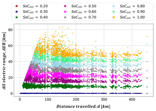 EREV all-electric range (AER) in dependence of trip length () for various initial SoC values ().