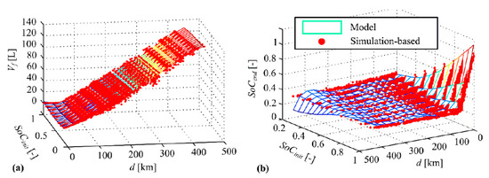 Figure 6 shows the relation of both the simulated fuel consumption Vf and the SoC at destination (i.e., at the end of a driving cycle, SoCend) with respect to travelled distance d for the case of SoCinit equal to 1.0 (Figure 6a), and for the case of SoCinit equal to 0.6 (Figure 6b). It can be observed from these results that the initial SoC and travelled distance d highly influence the fuel consumption Vf and SoC at destination (i.e., at the given d).