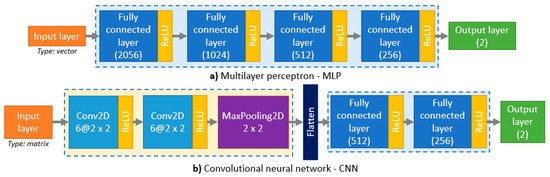 Block diagram of considered neural network architectures: multilayer perceptron—MLP (a), and convolutional neural network—CNN (b); The expression 6 @ 2 × 2 considers the depth of 6 (i.e., the number of convolutional filters in the given Feature Map), where the size of each filter corresponds to 2 × 2 pixels.