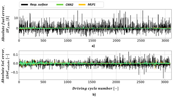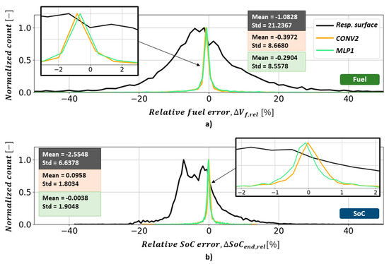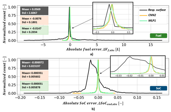 The fuel- and SoC-related absolute prediction errors ∆Vf,abs and ∆SoCend,abs are shown in Figure 10, while the distributions of absolute and relative errors calculated according to Equations (10)–(13), along with the corresponding mean values (Mean) and standard deviations (Std), are shown in Figure 11 and Figure 12, respectively. The results shown in Figure 12 indicate that most of the relative prediction errors for both ∆Vf,rel and ∆SoCend,rel and both MLP1 and CNN2 models are located within the ±2% interval, which are significantly better results when compared to the response surfaces model whose distributions of errors are far wider (i.e., ±20%).