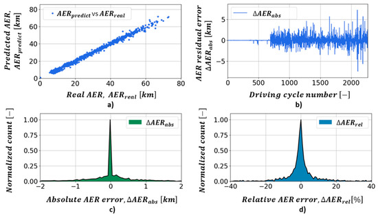 The corresponding CNN-based prediction results including the basic statistics of the absolute AER errors calculated as are given in Table 5. Figure 13a shows the plot of predicted AER (AERpredict) vs. real AER (AERreal), while the absolute AER errors ∆AERabs for a given testing dataset are shown in Figure 13b. The distributions of the AER-related residuals (i.e., and ) are shown in Figure 13c,d. These results show that the developed CNN-based model predicts the vehicle AER with an absolute error that is approximately 1 km (i.e., most of the points are located within the ±1 km interval; see Figure 13c). Regarding the relative AER error , the majority of points lays within the ±5% interval (see Figure 13d), which can be considered quite accurate for this kind of prediction tasks. It is worth noting that the same methodology can be used to predict the driving distance of fully electric vehicle, as well.