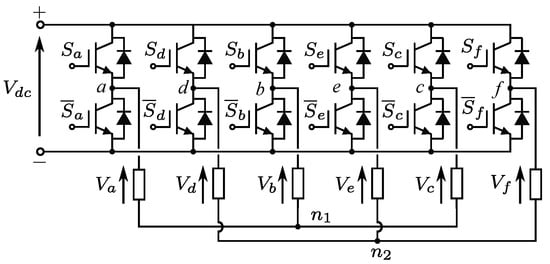 The two-level six-phase VSC is a popular topology within the research area because of their promising features [4]. An electrical diagram of this design is shown in Figure 1. The inverter is power-supplied through the dc-bus with a input voltage. This is processed by means of an arrangement of six legs, which in turns are composed by two power semiconductors in series. These last must operate in the complementary conduction mode to avoid damaging currents. Thus, the switching state (j = {a, b, …, f}) can be modelled with a bit signal, where = 1(0) indicates that the top(bottom) power switch of the leg j is activated. The variables of the three-phase sets are designated with the subscripts a-b-c and d-e-f, respectively. The switching functions provide different phase voltages , and a total of 64 combinations can be generated and calculated as follows [11]: