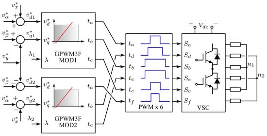 The systems of (6) and (7) are two independent three-phase modulation spaces according to the approach of [22]. Consequently, they can be implemented with the fast algorithm developed in the cited work. A description of the method is included in Appendix A. In this scheme, the left-side of the identities are the stationary reference voltages. Then, the modulators should be commanded with the following auxiliary target signals: