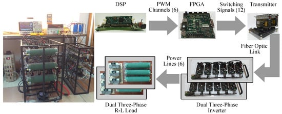The objective of this section is to provide the experimental proofs of the proper operation of the developed method. The architecture is composed by two three-phase generalised PWM blocks, whose performance was assessed only with single frequency tests. In this work, this scheme is commanded by reference voltages composed of a mix between two independent magnitudes and frequencies. Then, the proper generation of the output voltage in the time and frequency domains ought to be verified to demonstrated its viability for multiphase applications.