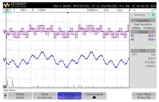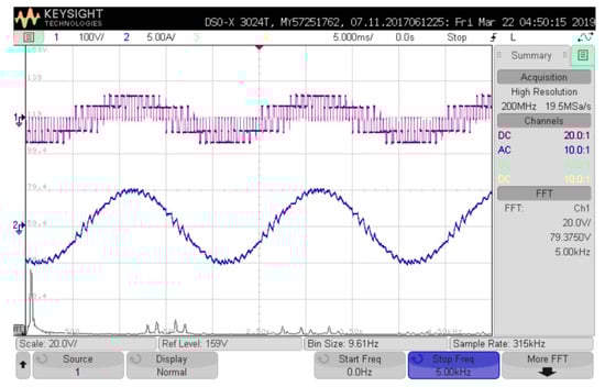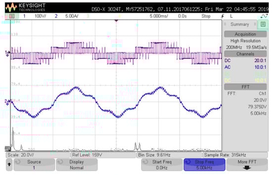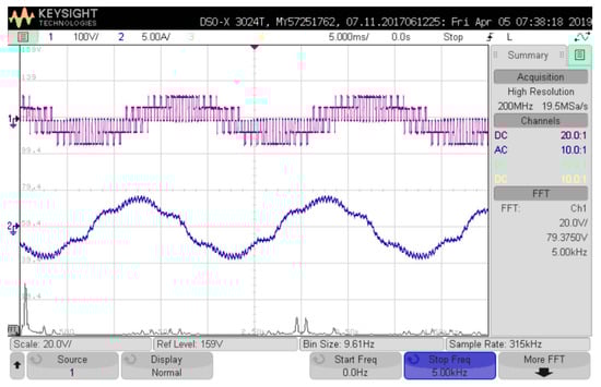 First, the single frequency test with the maximum modulation index [10], = 1.1547 and = 0, is depicted in Figure 4. The traditional switching pattern and sinusoidal current can be appreciated in the time response. The voltage spectrum attained with the discrete Fourier transform from 0 to 5 (kHz) and 500 (Hz) per division is also included in capture of the oscilloscope. This shows a clean spectrum in the low-order frequencies interval. The harmonics components are only the effect of the modulation process in the sidebands around the carrier frequency (-order harmonic component).