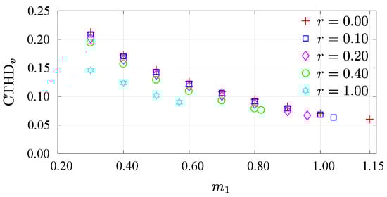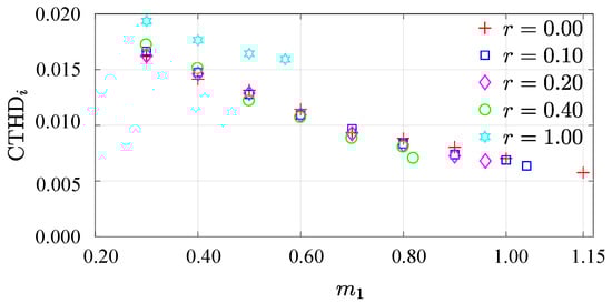 The behaviour of the CTHD achieved with the technique is illustrated in Figure 8. The single frequency tests provide the conventional total harmonic distortion [24], with decreasing values in all the intervals. The response of the scheme with ratios higher than zero shows similar characteristics. For the CTHD is practically identical to the first case, whereas for higher ratios the result is noticeably lower, see r = 1.00. The reason is the resulted sidebands of the spectrum. Notice that in the previous results of Figure 6, = and r = 1, the harmonic’s energy is distributed around and 2, while for the other combinations, Figure 4 and Figure 5, this is concentrated only in one of these frequencies. This effect generates a larger voltage harmonics that produce higher CTHD.