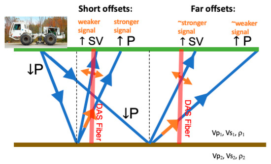 DAS is a novel new type of seismic data, thanks to a combination of fiber-optic cable and advances in optical, light-pulse technology [15]. Traditionally, seismic data is recorded by geophones or seismometers, which are coupled to the ground through spikes, and measure particle acceleration via voltmeters. Instead, DAS uses Rayleigh scattering in a fiber-optic cable to detect changes in strain rate due to seismic waves impinging on the fiber [16,17]. DAS is most sensitive to waves that have particle motion parallel to the orientation of the fiber; DAS is insensitive to particle motion perpendicular to the fiber orientation (referred to as broadside insensitivity). Figure 1 nominally depicts how a vertically-deployed DAS system may be more sensitive to certain reflected waves due to a horizontal reflector. In this simplified case, at short offsets (smaller distances between the source and the vertical DAS, shown on the left side) the vertical DAS will be more sensitive to reflected P-waves rather than S-waves (or specifically SV-wave: shear-waves with particle motion in the vertical direction) because the particle direction (orange arrows) is inline with the fiber. DAS sensitivity may switch to be higher for reflected S-waves at larger offsets, loosely depicted on the right side of Figure 1.