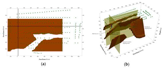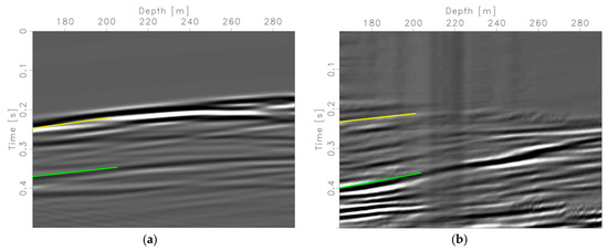 Figure 7 contains two flattened cubes that used the P–P kinematics to produce the illumination-compensated reflectivity images (RIC, Equation (4)) for locations at PoroTomoY = 124 m, PoroTomoX = 672 m, and depth = 420 m, about 225 m deeper and 560 m northeast from the locations shown in Figure 4. Figure 7a contains the RTM result using the synthetic data (a. Wr = synthetic), while Figure 7b is from the Brady’s field data (b. Wr = DAS). These flattened cubes focus on the deepest of the three northwestern-dipping (negative PoroTomoX direction) faults (Figure 2). The intersection of the slices is approximately Northeast (positive PoroTomoY and PoroTomoX direction) of Well 56-1A. The black structures are the fault intersections from the Siler & Faulds model (Figure 2).