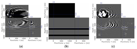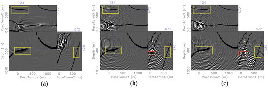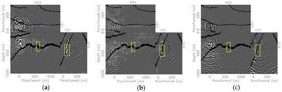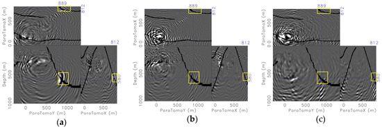 The effect of the velocity model can be seen in some of the RTM images. In the depth slice (upper left) of the a and b images in Figure 8, the focusing effect of the velocity model is seen along the middle West-dipping fault (see Figure 4 for the general patterns of the velocity). Focusing is caused by patterns of higher velocities, in this case, these may be artifacts of the acquisition geometry itself [28]. Focusing is also seen in the PoroTomoX and PoroTomoY panels. In the lower right panels, there are brighter spots that begin PoroTomoX = 500 and depth = 500, which coincide with a higher (4500 m/s versus 4000 m/s) velocity structure. There are also focusing patterns below the yellow box in the lower left panels.
