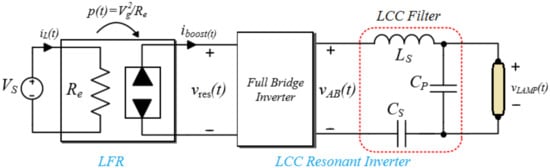 The stability of the cascade connection of the two converters will be ensured if the output impedance modulus of the first stage is smaller than the input impedance modulus of the second stage for all operating frequencies [27]. Figure 7 depicts the Thévenin’s model of the cascade connection of the LFR stage and the resonant inverter. is the output impedance of the LFR and is the input impedance of the inverter. From Figure 7, the following expression holds