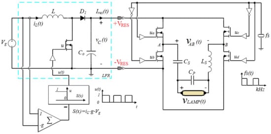 Figure 2 depicts the schematic of the proposed ballast. The LFR is implemented by an appropriate sliding-mode control in a boost converter supplied by low-voltage DC source (such as a car battery) ranging from 12 V to 15 V. The figure shows a DC input, but the proposed approach can also be applied in the case that is the AC input from a rectifier. Also in the figure, a boost converter is considered, but other topologies (such as the buck-boost, flyback or forward) could be employed if the ballast is supplied from the grid.