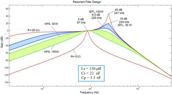 Figure 6 depicts the frequency response of for different values of lamp power and resistance. There are two different resonant frequencies, i.e., the series resonant frequency , around 90 kHz, and the main resonant frequency , slightly below 250 kHz. The values of the tank components, namely μH, nF, and nF are obtained by solving a set of equations as explained below.