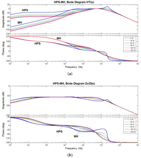 Frequency response of and for the HPS and MH cases. (a) Bode Diagram of ; (b) Bode Diagram of .