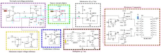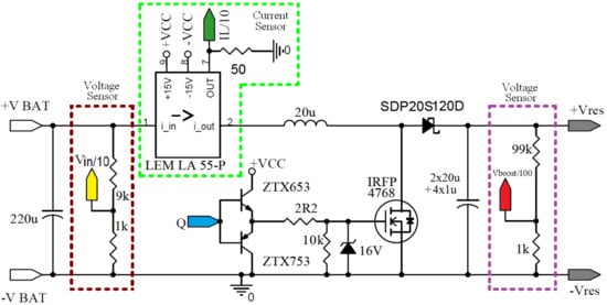 The switch-driver input signal Q is activated by the hysteretic comparator as illustrated in Figure 11. In the control circuit, the input and output voltages are sensed by two voltage dividers, and the input current sensor is a Hall effect transductor model (LEM LA 55-P) with a bandwidth of 200 kHz. Signals Vin/10, Vboost/100, and IL/10 are proportional to the input voltage , the output voltage , and the inductor current respectively.