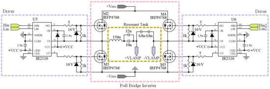 The second stage, which is shown in Figure 12, consists of a full bridge and a resonant tank. The full bridge employs four MOSFETs (IRFP4768), featuring E24 gate resistances of 5 Ω, and a parallel protection network with a 1 kΩ resistance and the 16 V zener diode. Regarding the resonant tank, the series inductor has been built in-house, using a 14-strands 0.07 mm2 litz wire. The winding has 18 turns around a Molypermalloy 55868-A2 core. The series capacitor comprises two polypropylene capacitors of 12 nF and 10 nF (Vyshay) in parallel and with a breakdown voltage of 2 kV. Finally, the parallel capacitor consists of two 4 kV 6.8 nF polypropylene capacitors connected in series.