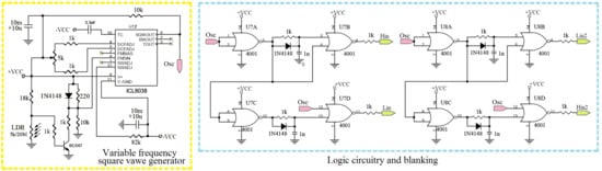 The switches are activated by two IR2110 drivers, whose inputs are given by a logic network, shown in Figure 13, which assures a minimum blanking-time between the high-side and low-side MOSFETs. Depending on the lamp and the mode of operation, the blanking delay network is activated at a given constant frequency by a voltage-controlled oscillator. As an example, conventional lamps (HPS or MH) can be started at the main resonant frequency = 245 kHz, but are operated in steady-state at the series resonant frequency = 90 kHz. The proposed oscillator is based on the ICL8038 analog function generator integrated circuit. By adding the npn transistor BC547, the 1N4148 diode, three resistors, and an LDR (light dependent resistance) the frequency of the oscillator is reduced automatically to 90 kHz during the first seconds of the lamp warm-up, before the lamp begins to change the color. Since the transformer coil of the IEFL lamp is designed to operate around 240 kHz, the LDR used to reduce the inverter switching frequency is not used in this case.