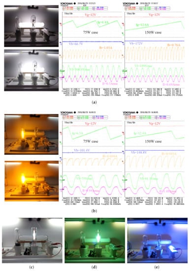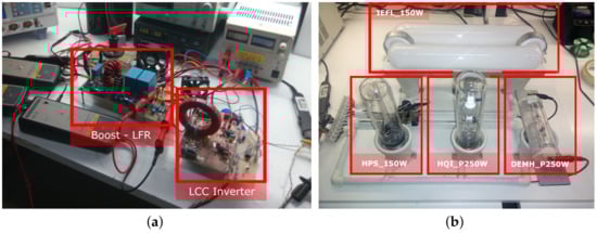 Figure 14a shows the power stage of the ballast, whereas the four different discharge lamps used to test the ballast can be seen in Figure 14b. These lamps are: two 250 W metal-halide lamps (the HQI-T PRO with greenish light, and the I-Quarium DE-MH with bluish light), the 150 W HPS-T sodium vapor lamp with orange light, and the 150 W Endura IEFL lamp.