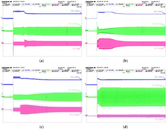 Waveforms of , and showing strike, warm-up, and steady operation at 150 W with the four different lamps: (a) 250 W HQI-T PRO (greenish light MH); (b) 250 W I-Quarium DE-MH (bluish light MH); (c) 150 W HPS-T Basic Plus (orange light); and (d) 150 W IEFL Endura Luminarc (white light).