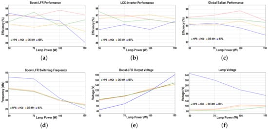 To analyze the performance of the proposed ballast with different lamps, the ballast has been tested in steady-state at different power levels, which correspond to dimming operation: 50 W, 70 W, 100 W and 150 W of input power. To simplify the analysis, the input voltage is constant and equal to 12 V, and input power is adjusted by means of the LFR controller. Figure 16 shows: (a) the efficiency of the first boost-LFR stage, (b) the efficiency of the LCC inverter, (c) the overall ballast efficiency, (d) the boost-LFR switching frequency, (e) the boost-LFR output voltage, and (f) the voltage of the lamp. The overall efficiency of the lamp is well above 90% for most of the cases and power outputs, except for the IEFL case at full power. One of the reasons behind this is the voltage variation range of the IEFL lamp that under dimming operation is wider than in other lamps. The power efficiency of the proposed approach at similar power levels can be compared with single-stage ballasts ranging from 83% [12] to 93% [13] and conventional two-stage ballasts whose efficiencies are typically around 85% to 90% [14].