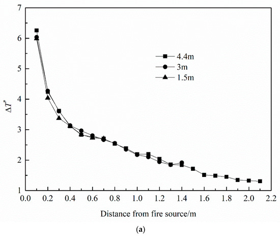When the distance from the fire source to the inner boundary of the extraction vent is substituted to Equation (7), we can get the smoke temperature rise under the inner boundary of the extraction vent ΔTb as follows.