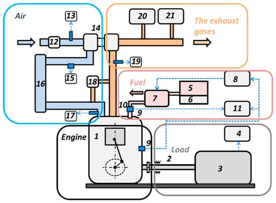 The scheme of engine testing equipment: 1—compression ignition engine; 2—shaft; 3—engine load stand; 4—engine brake torque and speed recording equipment; 5—fuel tank; 6—fuel scales; 7—high-pressure fuel pump; 8—start of fuel injection control equipment; 9—crankshaft position sensor; 10—start of fuel injection sensor; 11—start of fuel injection recording equipment; 12—air mass meter; 13—intake air temperature meter; 14—turbocharger; 15—turbocharger pressure meter; 16—air cooler; 17—intake gas temperature meter; 18—exhaust gas recirculation (EGR) valve; 19—exhaust gas temperature meter; 20—exhaust gas concentrations analyzer; 21—smokiness meter.