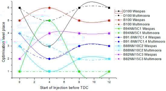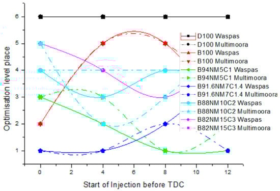 Experimental research with various fuels and different engine tuning parameters yields a multi-criteria problem which can be solved applying multicriteria decision-making methods (MCDM) methods. The MCDM analysis is often used to address multiple technical issues, for example, for the assessment and selection of renewable energy technologies [44,45,46,47], development of biomass technologies [48], ecological building assessment [49], reduction potential [50], to evaluate various failure modes more precisely [51], etc. Using the step-wise weight assessment ratio analysis (SWARA) method, the evaluation factors affecting electronic learning [52] logistics [53,54], employee selection [55], and logistic provider selection [56] were analyzed. Ratings of corporate social responsibility indicators are based on SWARA and additive ratio assessment (ARAS) [57]. Investment priorities in high-tech industries are determined by the step-wise weight assessment ratio analysis complex proportional assessment (SWARA-COPRAS) method [58].