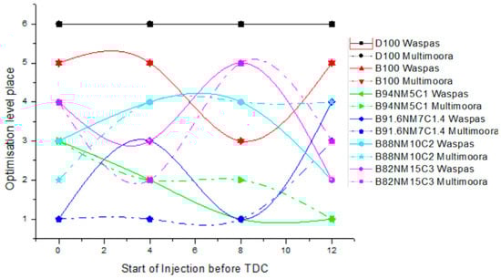 The use of O2-containing fuel adds to the combustion process, and improves the energy and environmental performance of the engine [74]. However, as the oxygenate concentration increases in fuel, the physic-chemical properties of the fuel mixture change and, consequently, the fuel becomes more volatile, changes its injection characteristics, reduces the heat content of the fuel mixture, and increases fuel consumption (Table 4 shows the results of the experiments). Therefore, it is essential to regulate the angle of fuel injection to achieve a more reliable balance between energy and ecological indicators in different engine loads.