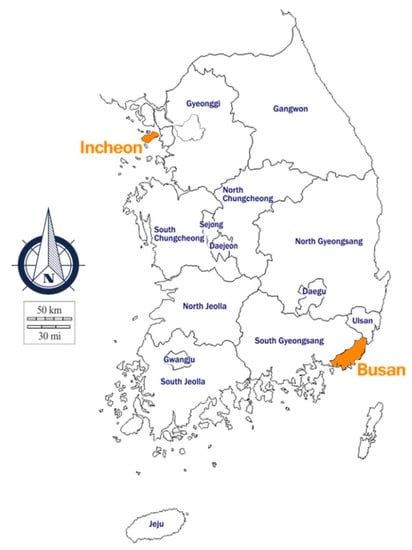 In this study, meteorological data were collected from two weather stations, namely Busan (Longitude, 129°03′ E; Latitude, 35°10′ N; Altitude, 69.2 m) and Incheon (Longitude, 126°70′ E; Latitude, 37°45′ N; Altitude, 21.12 m), in South Korea (Figure 1). These stations are operated and maintained by the Korea Meteorological Administration (KMA). The weather data consist of 16 years (from 2000 to 2016) covering daily records of air temperature (TA), sunshine duration (SD), relative humidity (RH), vapor pressure (VP), sea-level pressure (SLP), pan evaporation (PE), and daily solar radiation (DSR).