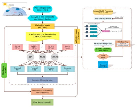 In this study, hybrid forecasting models (i.e., CEEMDAN-GEP, CEEMDAN-MARS, and CEEMDAN-SaMARS) are designed using MARS model with CEEMDAN to eliminate non-stationary time series. The efficiency and capability of the proposed hybrid models are compared with three standalone models (e.g., GEP, MARS, and SaMARS) for DSR forecasting in Busan and Incheon stations, South Korea. Figure 3 indicates the main steps of proposed models for enhancing the model’s performance. Also, the design parameters of GEP and MARS models for calibration at Busan and Incheon stations are presented in Table 2.